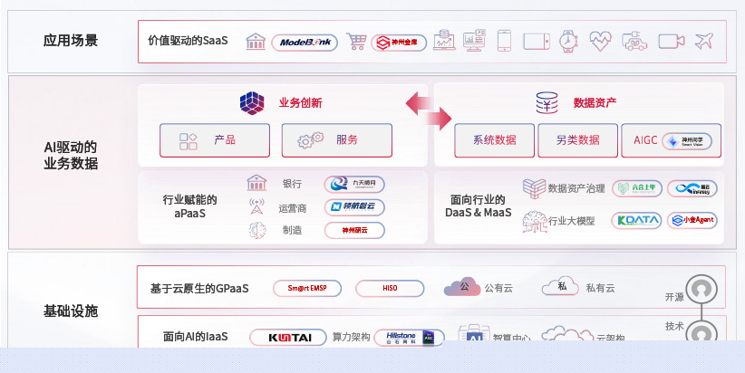在基础设施层面,基于商业或开源的云原生就绪开发工具与技术组件(PaaS)和面向AI的底层公共基础设施资源(IaaS),将共同支撑企业完成数字化转型